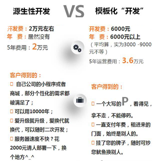 目前搞小程序模板開(kāi)發(fā)的公司眾多,不排除存在個(gè)別誠(chéng)信經(jīng)營(yíng)企業(yè),但大多是在鋪設(shè)騙局,“例如有個(gè)XX贊商城平臺(tái),以前為用戶做商城系統(tǒng)的,起先打出免費(fèi)建商城的概念,打出的口號(hào)也是一鍵開(kāi)發(fā),現(xiàn)在轉(zhuǎn)向小程序開(kāi)發(fā),口號(hào)基本類似:開(kāi)發(fā)方便,一鍵搞掂。有很多客戶交了六七千元的模板開(kāi)發(fā)費(fèi)用,客戶收到的小程序,只有基本的展示功能,沒(méi)有任何個(gè)性化的開(kāi)發(fā),這種結(jié)果是客戶完全不滿意,還要每年上交5000-8000元的“小程序運(yùn)營(yíng)費(fèi)用”,而且始終無(wú)法脫離這個(gè)第三方“開(kāi)發(fā)”公司,這對(duì)小程序開(kāi)發(fā)行業(yè),造成非常大的信譽(yù)危害。號(hào)稱用“模板化開(kāi)發(fā)”的公司,賺錢來(lái)得快,“你在百度里查‘小程序開(kāi)發(fā)’,那些做小程序開(kāi)發(fā)廣告的公司,基本上都是‘模板化開(kāi)發(fā)’,因?yàn)檫@種模式賺錢快:一個(gè)客戶入駐的開(kāi)發(fā)費(fèi),只收6000,以后每年收6000元,看上去是比一次性收2萬(wàn)元做源程序開(kāi)發(fā)費(fèi)劃算多了,更多客戶也愿意接受這種分期付款模式。其實(shí)仔細(xì)一算帳,客戶大虧。”“我們當(dāng)然不能說(shuō),所有做模板化開(kāi)發(fā)的公司,就是騙子公司,但是他們的客戶不知情——他們拿到的產(chǎn)品,永遠(yuǎn)無(wú)法有自己程序升級(jí)換代的能力,無(wú)法加入一丁點(diǎn)兒個(gè)性化開(kāi)發(fā)的功能——對(duì)方的后臺(tái),大家一起用的,怎么給你修改呢?”如果客戶實(shí)在需要加入個(gè)性化的部分,這種平臺(tái)一般會(huì)跟客戶推薦:“我們這幾個(gè)功能模塊跟您的需求有點(diǎn)相似,要不要購(gòu)買這幾個(gè)功能呀?”